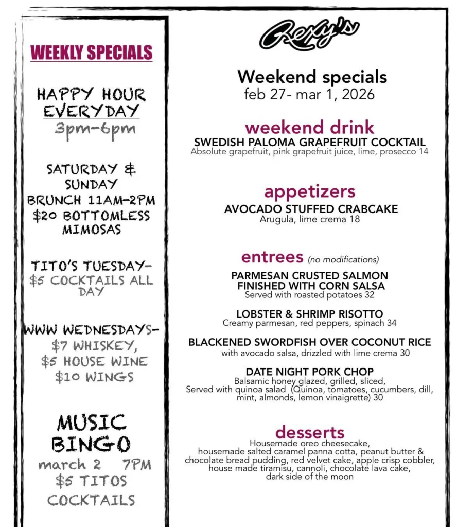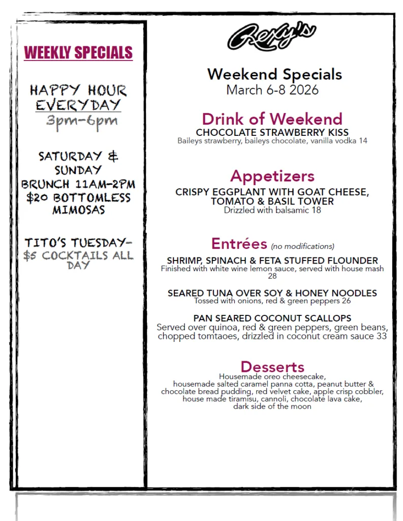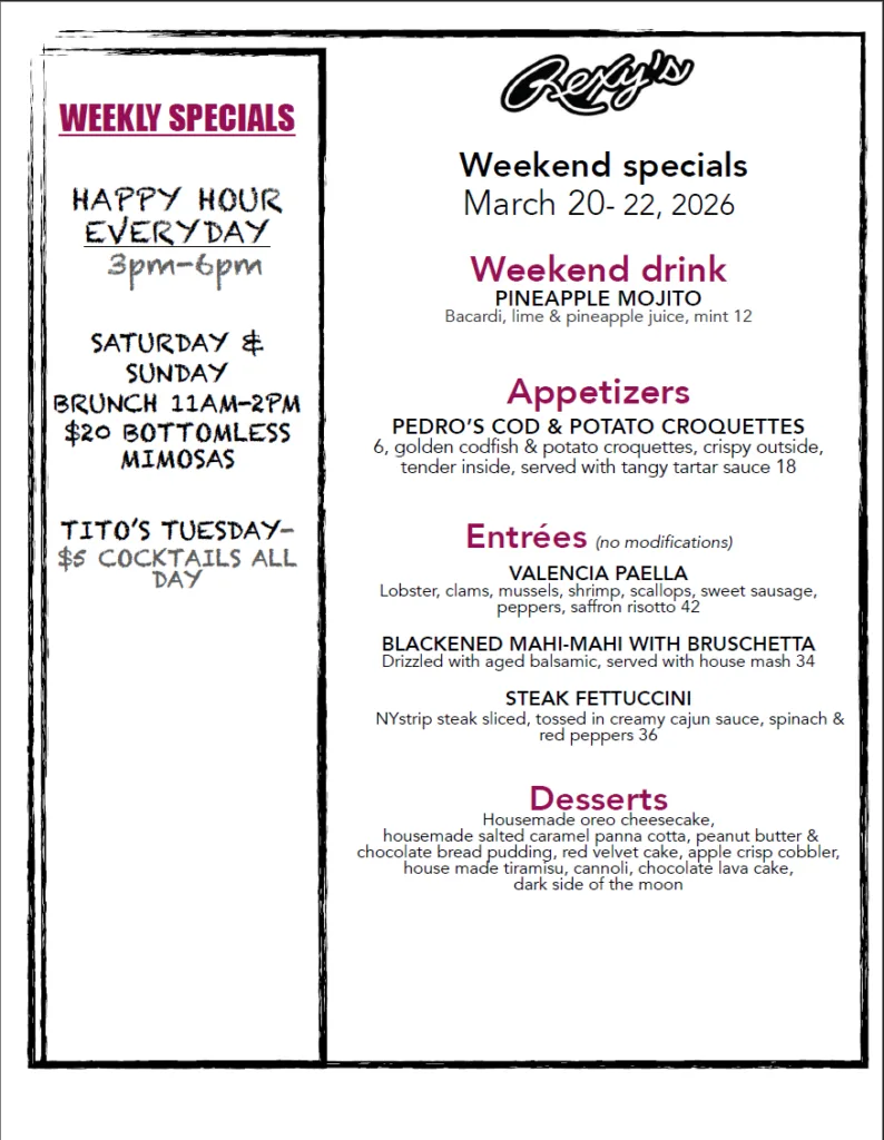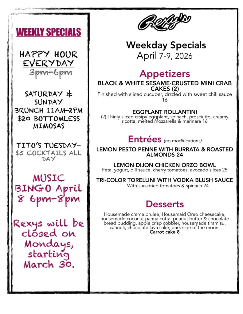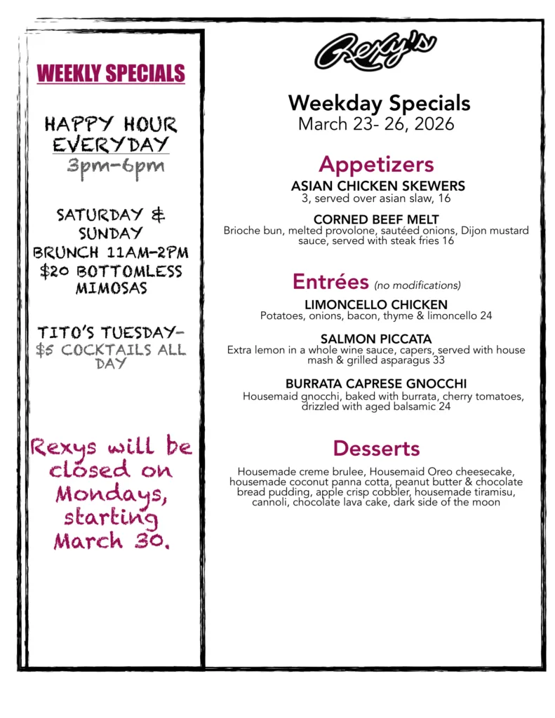 Rexy’s Restaurant & Bar is all about creating a welcoming place to relax, connect, and enjoy a great meal. Our menu brings together comfort favorites and elevated dishes, paired with a full bar and a laid-back atmosphere that feels right for any occasion. Join us for Happy Hour from 3pm to 6pm throughout the entire restaurant and enjoy great drinks and bites in every corner of Rexy’s.