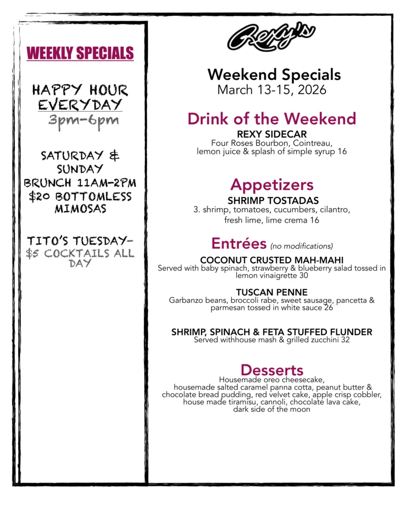 Since 1943, Rexy’s Restaurant and Bar has been a South Jersey iconic restaurant. Serving our famous “Sausage Pizza,” Hand-Cut Meats, and Fresh Pasta. In 2011, Rexy’s underwent an exterior and interior transformation, expanding the Bar Area, introducing a new outdoor patio dining, and updating the menu. Craft Beers on Tap; a Rotating Wine List, and weekly Chef Features!
