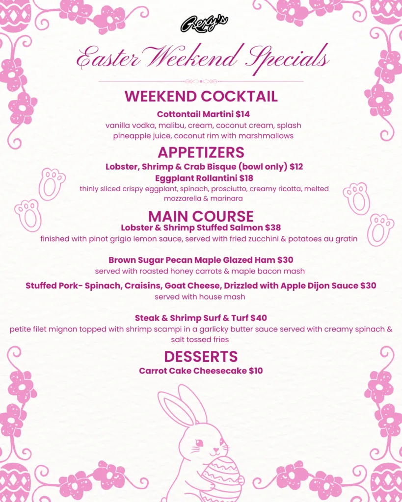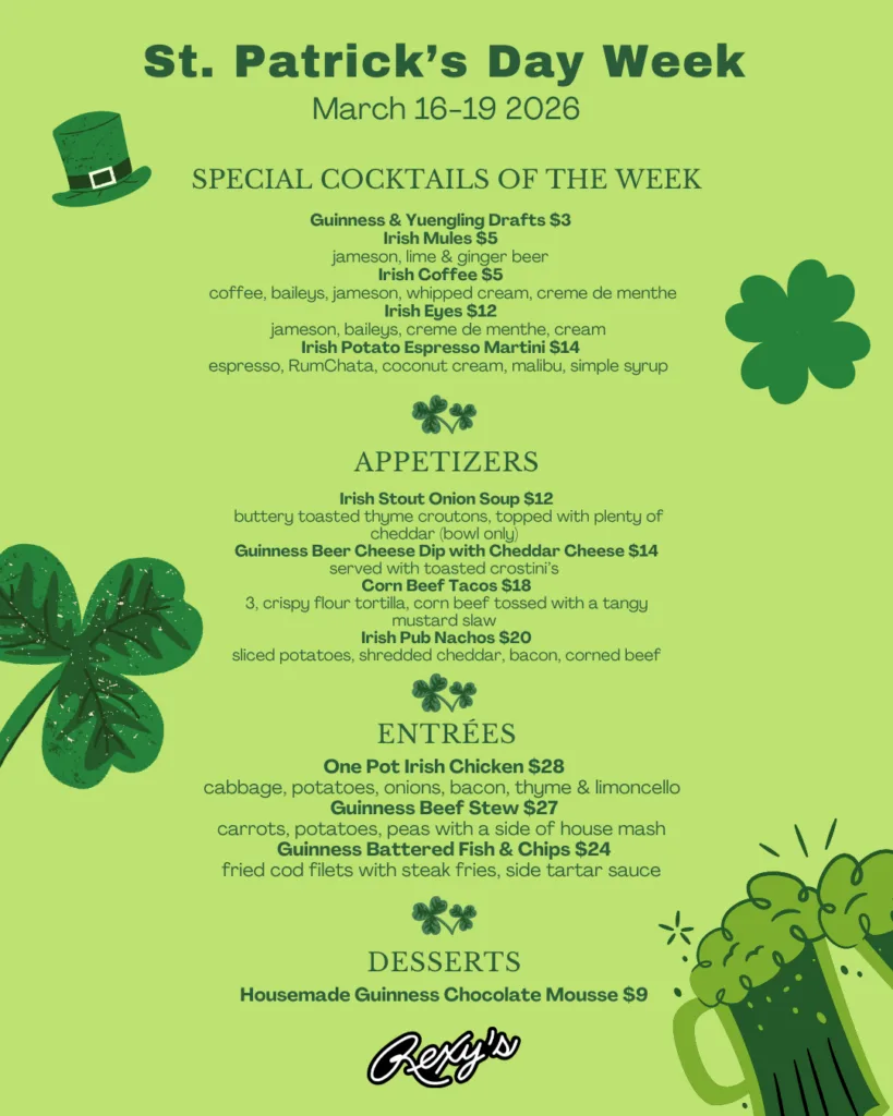 Unwind the best way. Grab a seat, order something cold, and snack your way into the night. Happy Hour at Rexy’s is built for quick meetups, post-work hangs, and the “one drink turns into two” kind of plans.